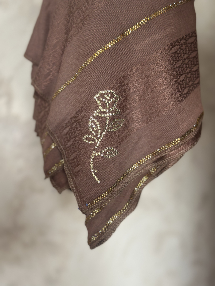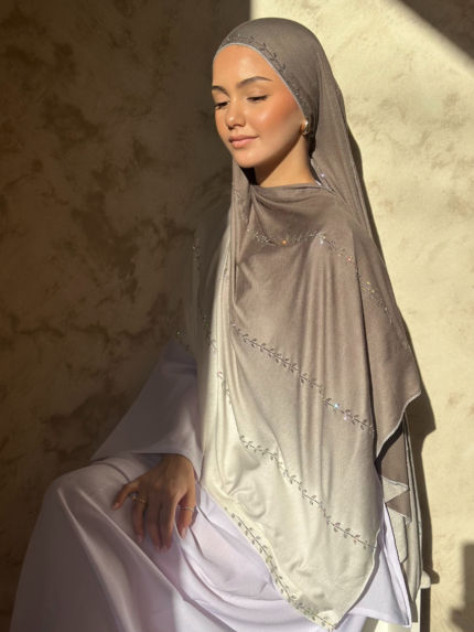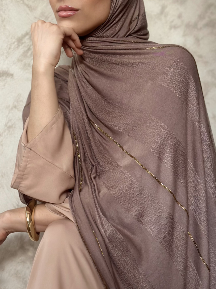 Este hijab de jersey importado desde Dubái es la definición de elegancia moderna. En tono marrón claro con brillos dorados integrados y un relieve discreto en la propia tela, eleva cualquier outfit sin esfuerzo.