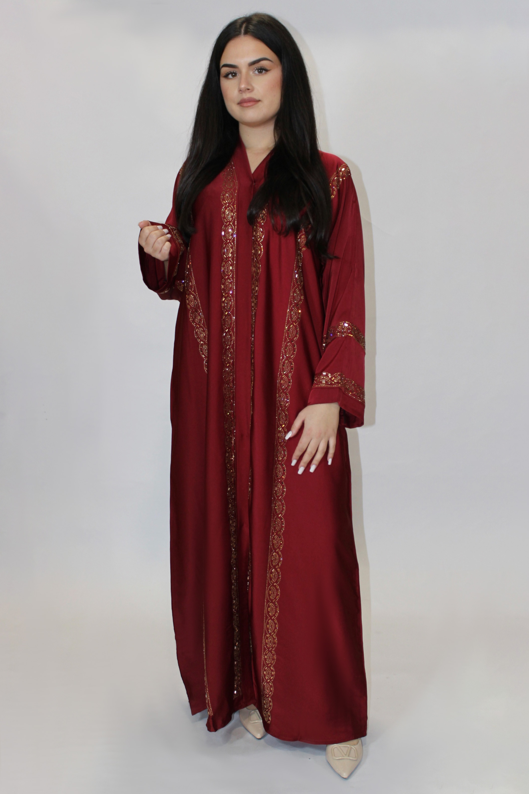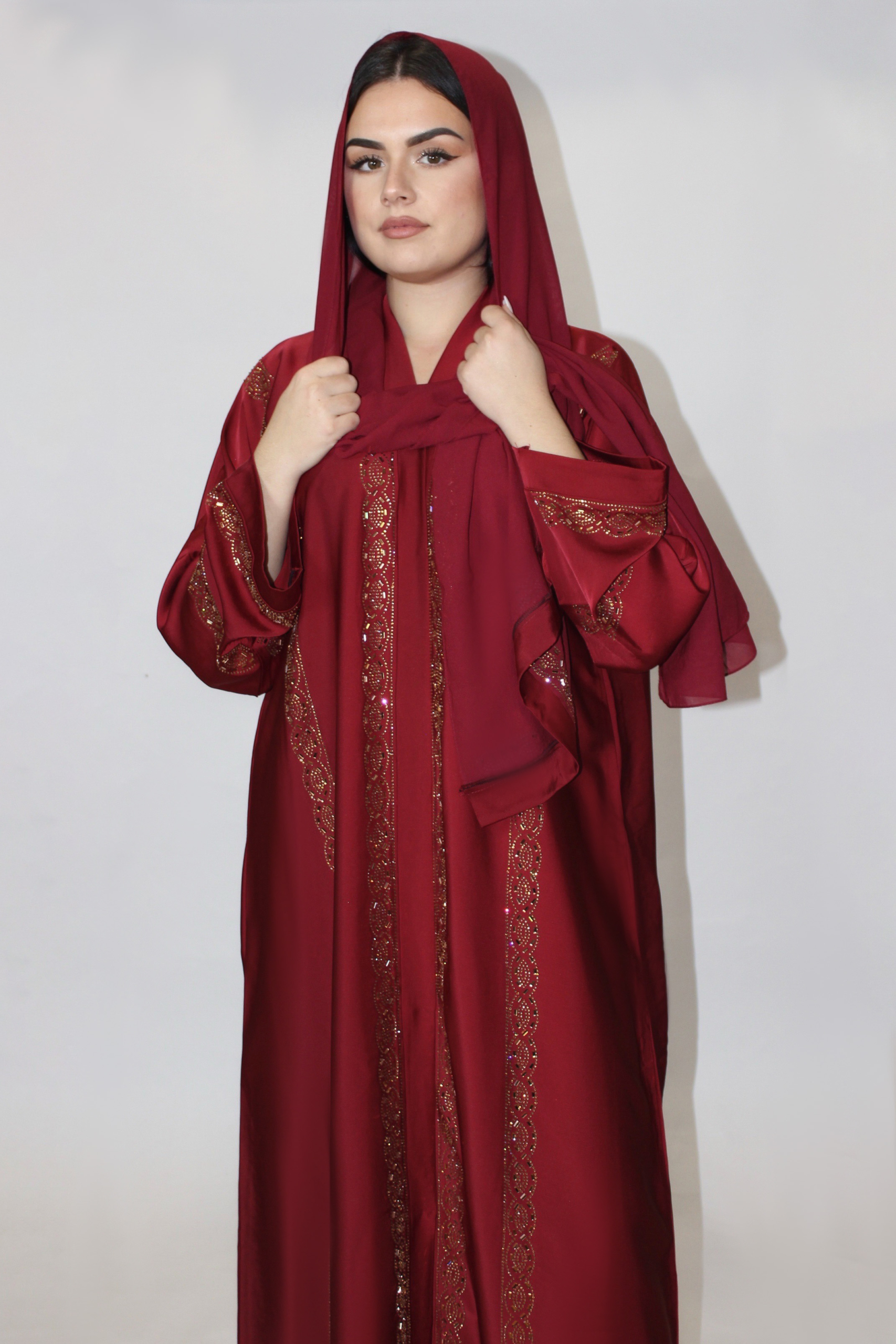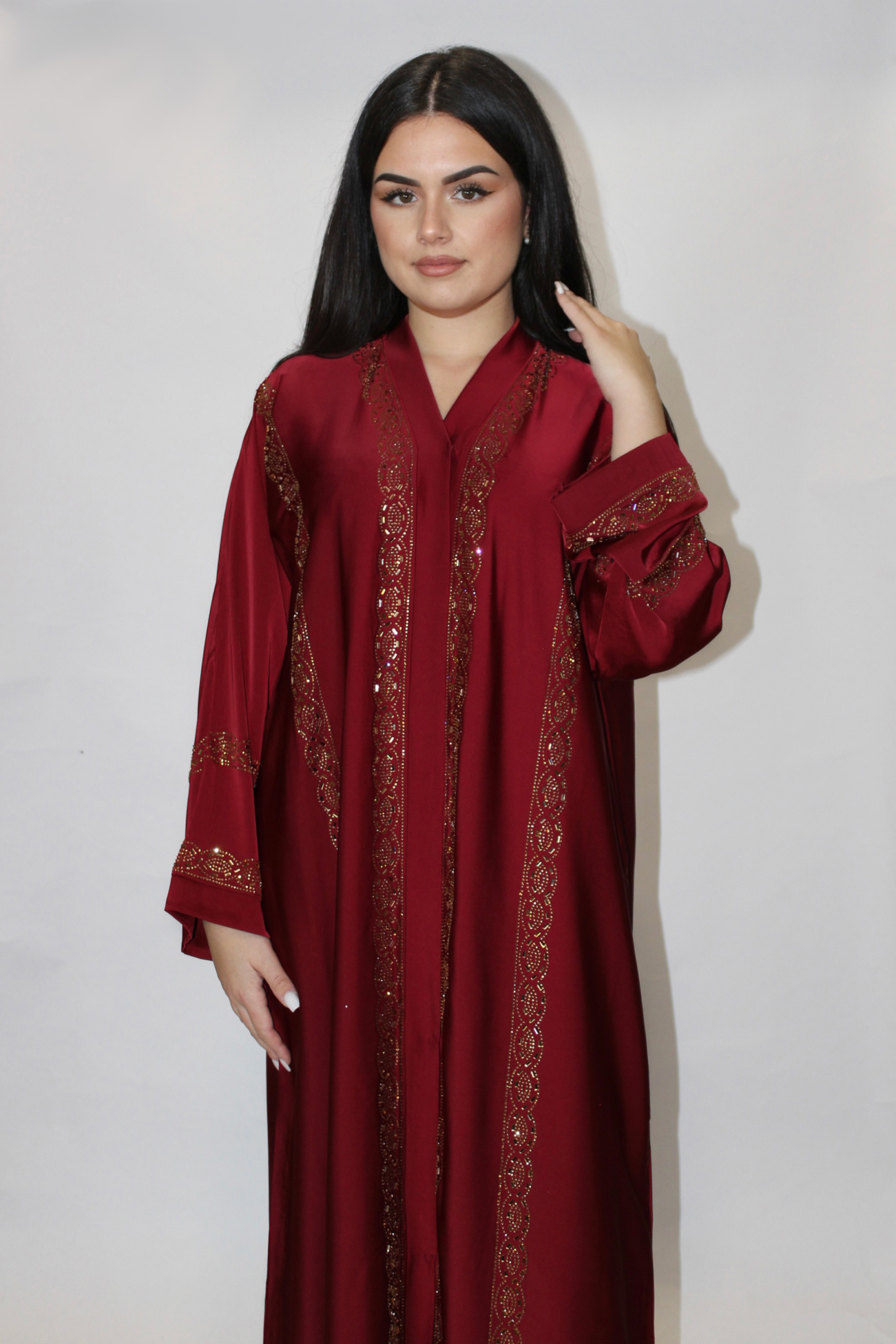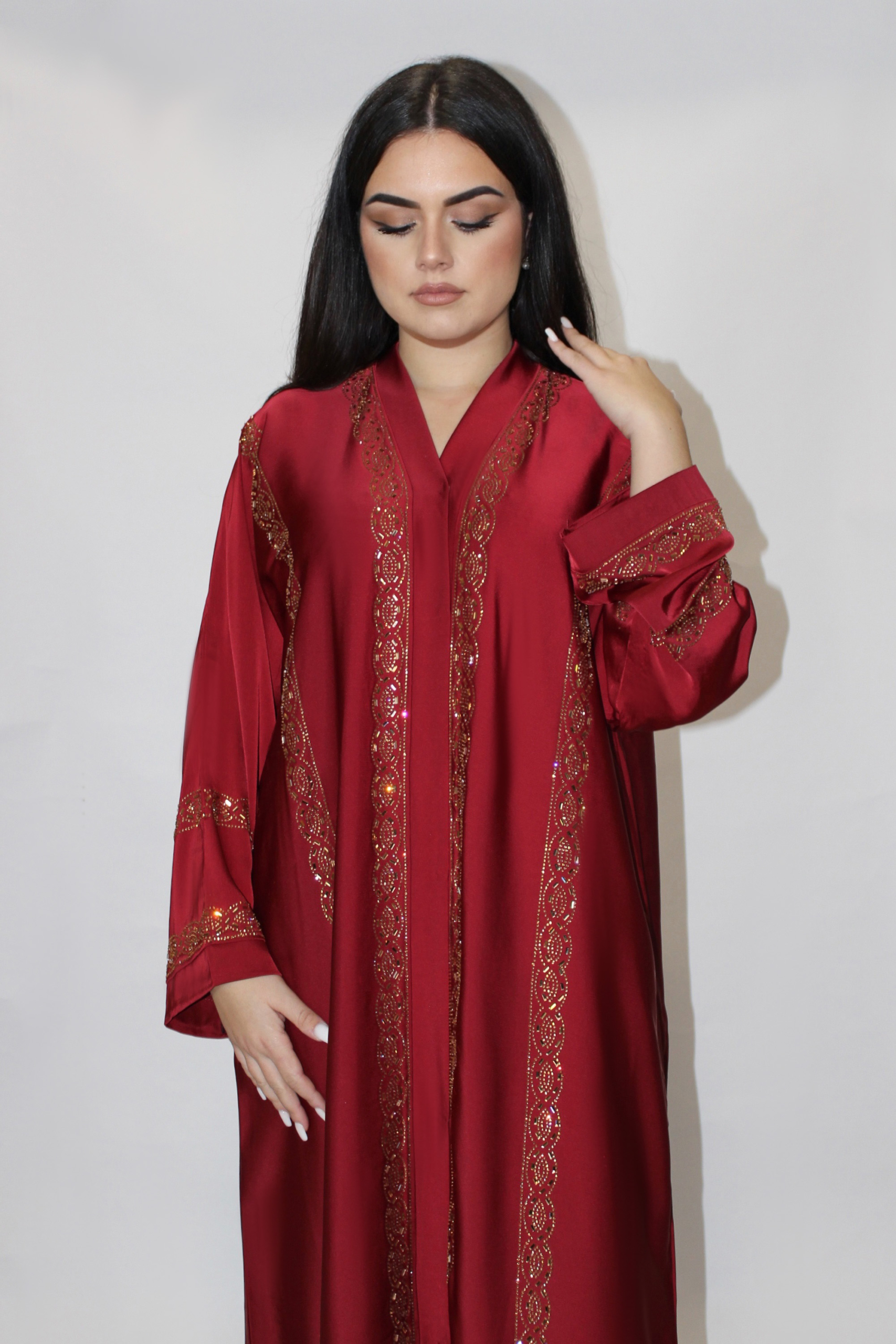 Abaya efecto satén con caída fluida y brillo elegante, perfecta para eventos, Eid y ocasiones especiales. Detalle de pedrería en frontal y mangas que estiliza la figura sin marcar. Tejido suave y cómodo para llevar todo el día.