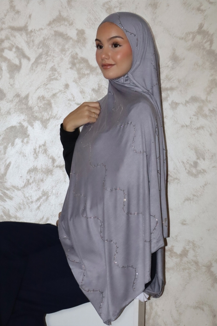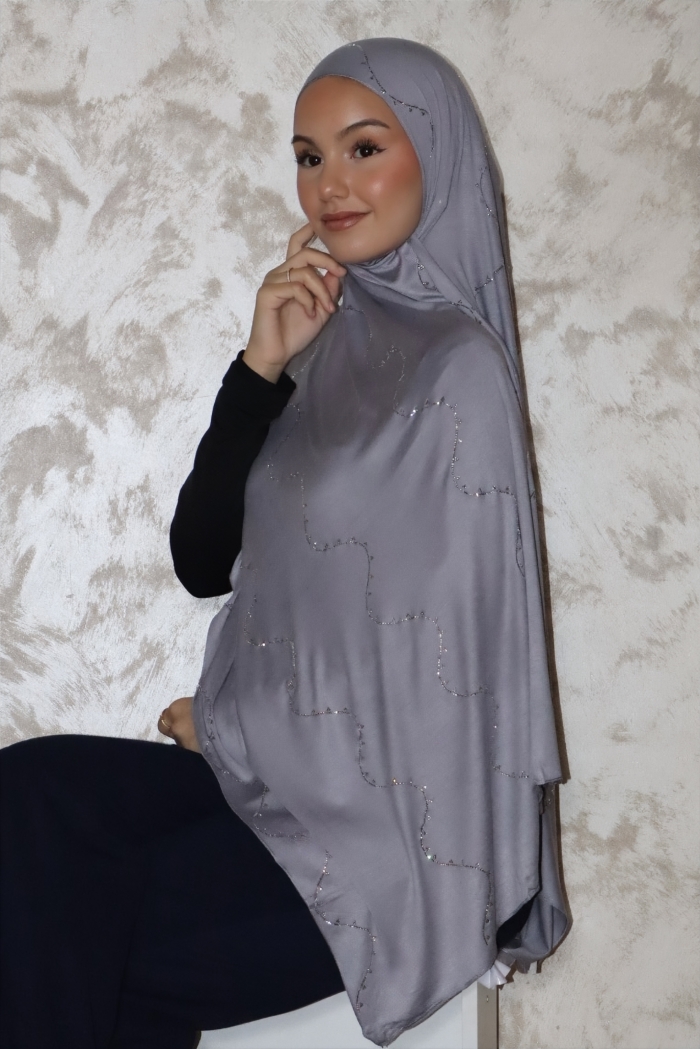 Elegancia y confort se unen en este pañuelo de jersey suave, con un sutil degradado en tono gris y bordes decorados con brillo delicado. Su caída perfecta y diseño exclusivo lo convierten en el accesorio ideal para cualquier ocasión.