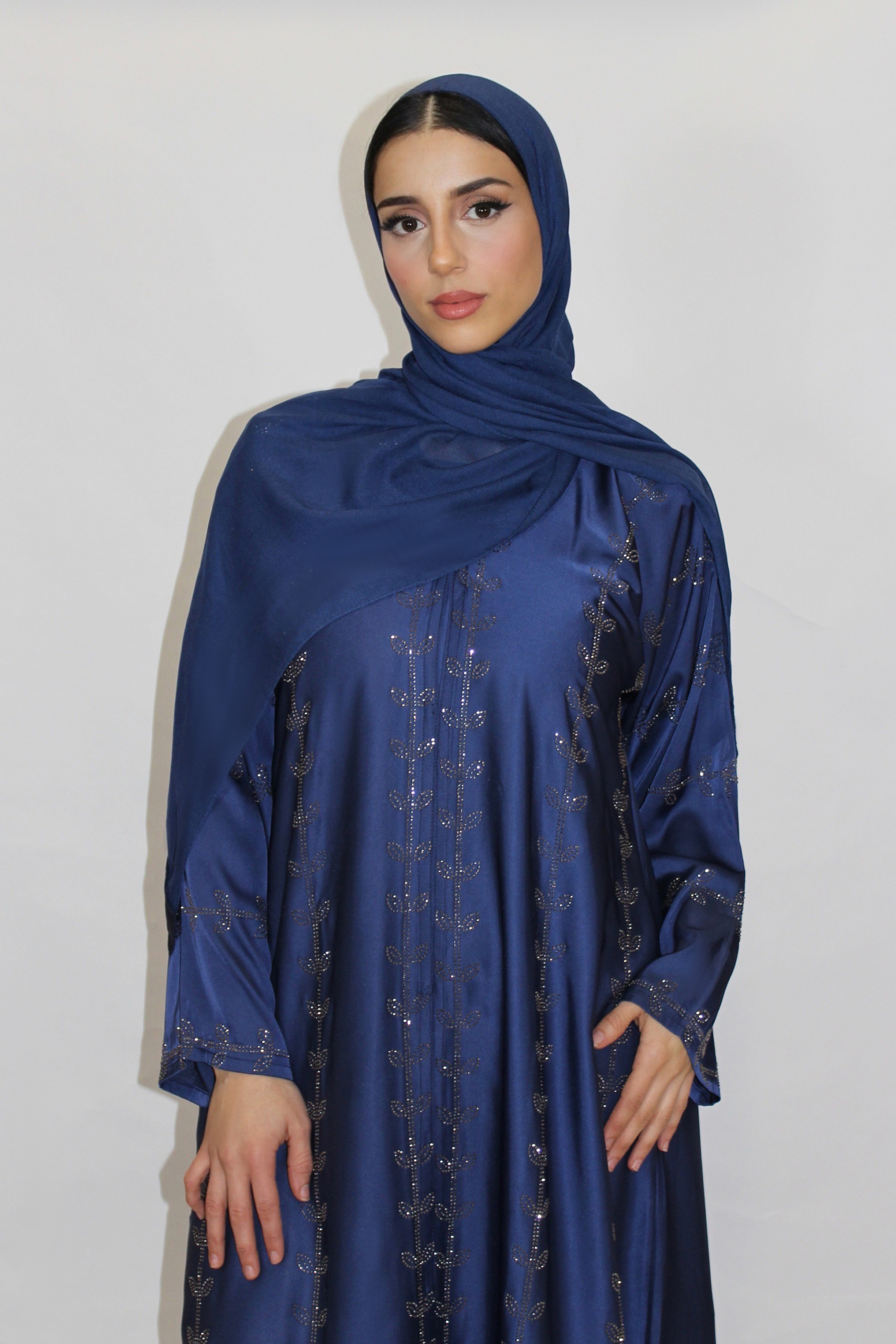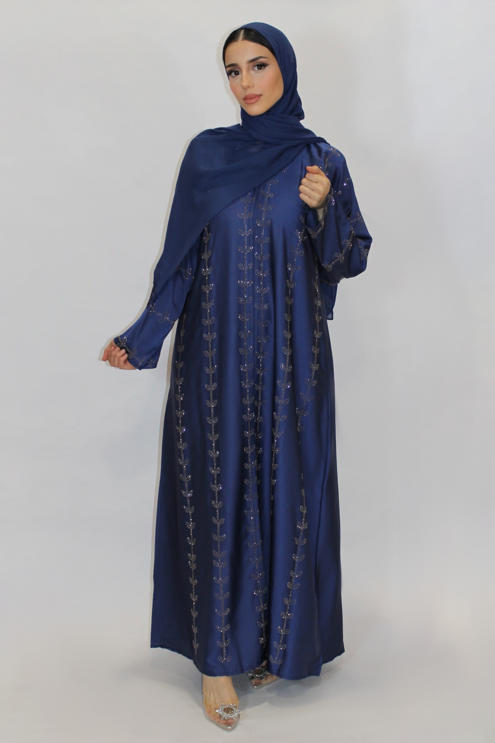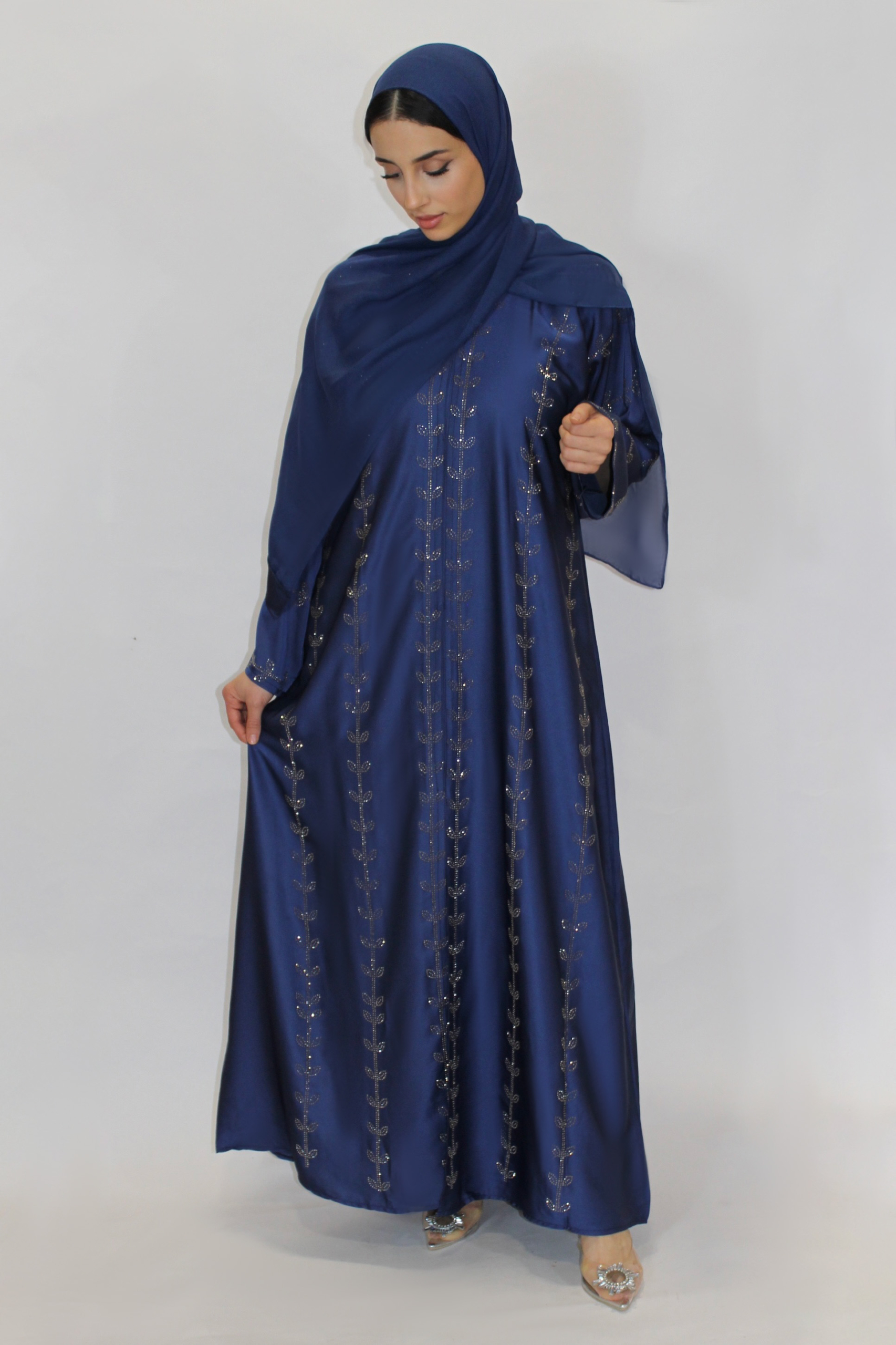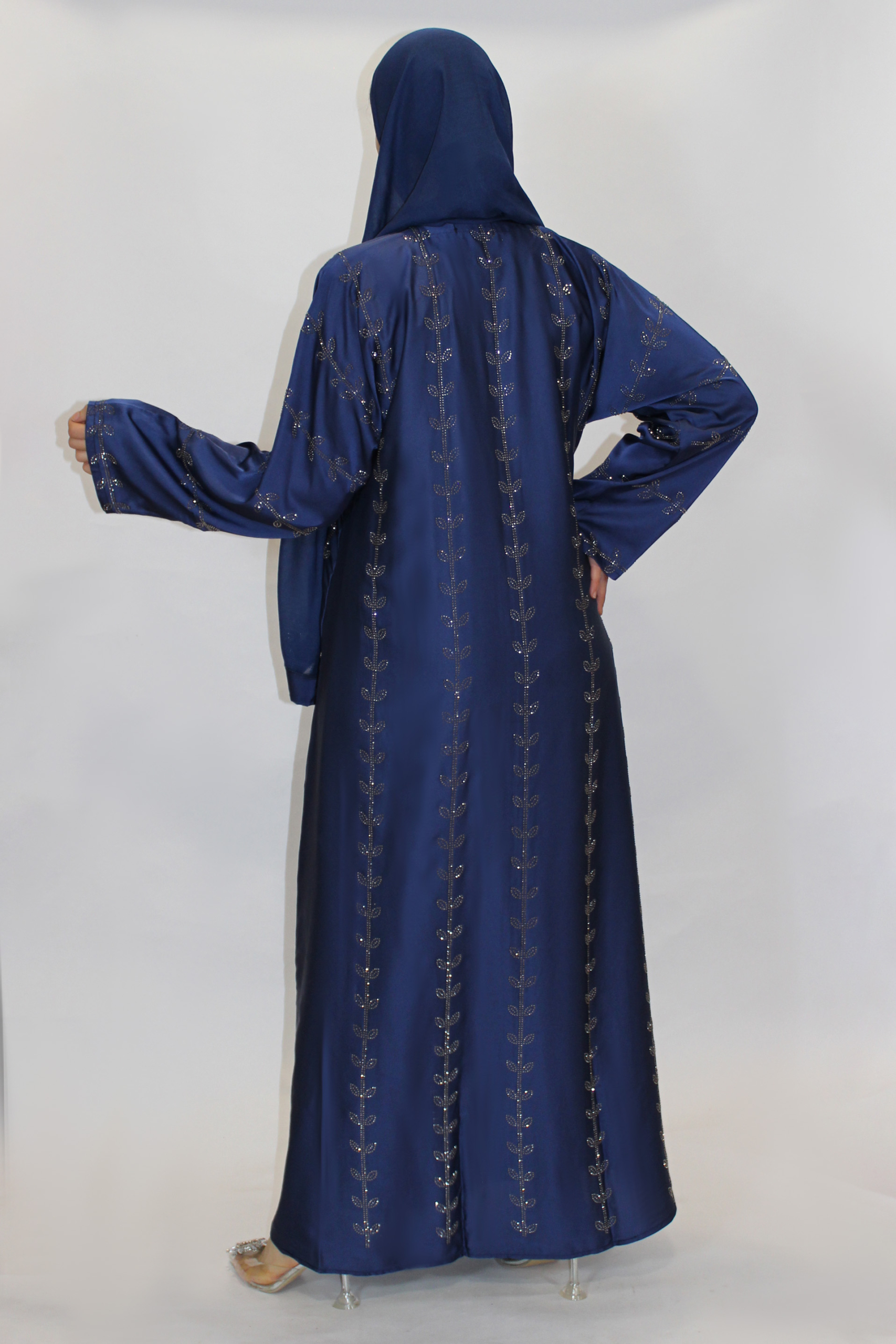 Abaya satinada con un diseño elegante de pedrería en forma de ramitas que recorre todo el frontal y las mangas, creando un efecto luminoso y muy estilizador.
