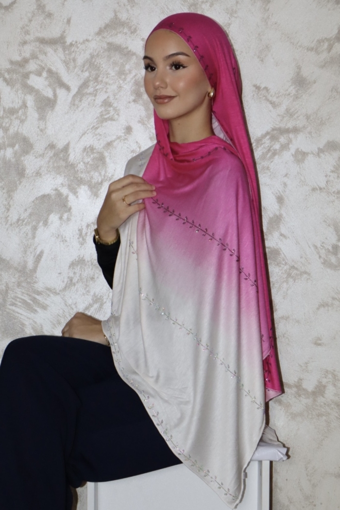 Elegancia y confort se unen en este pañuelo de jersey suave, con un sutil degradado en tonos tierra y bordes decorados con brillo delicado. Su caída perfecta y diseño exclusivo lo convierten en el accesorio ideal para cualquier ocasión.