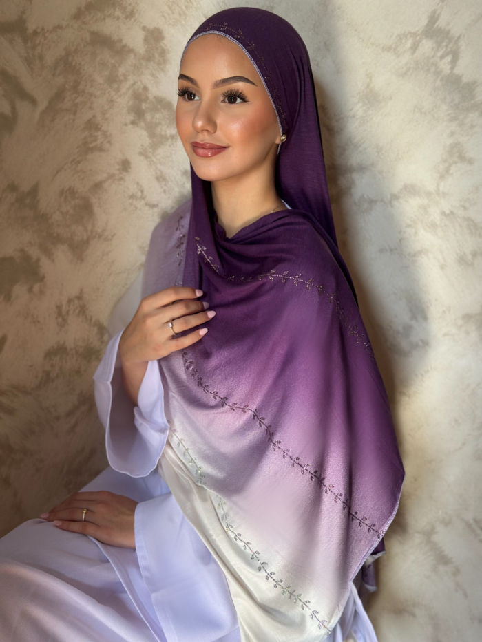 Elegancia y confort se unen en este pañuelo de jersey suave, con un sutil degradado en tonos lilas y bordes decorados con brillo delicado. Su caída perfecta y diseño exclusivo lo convierten en el accesorio ideal para cualquier ocasión.