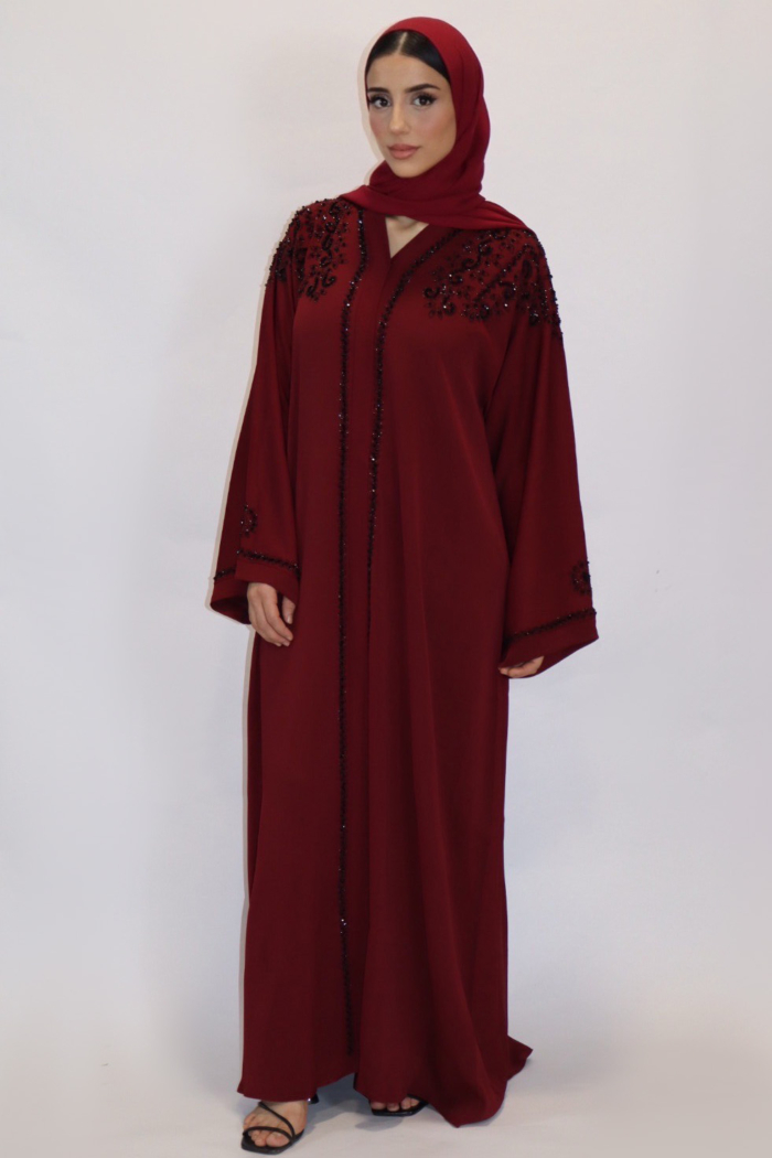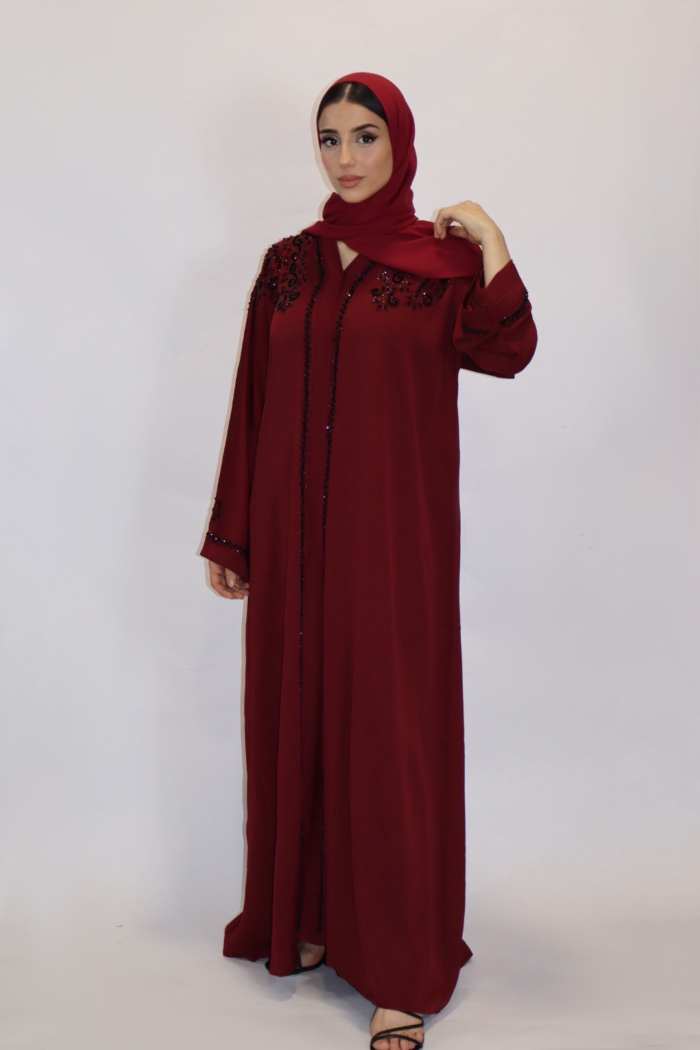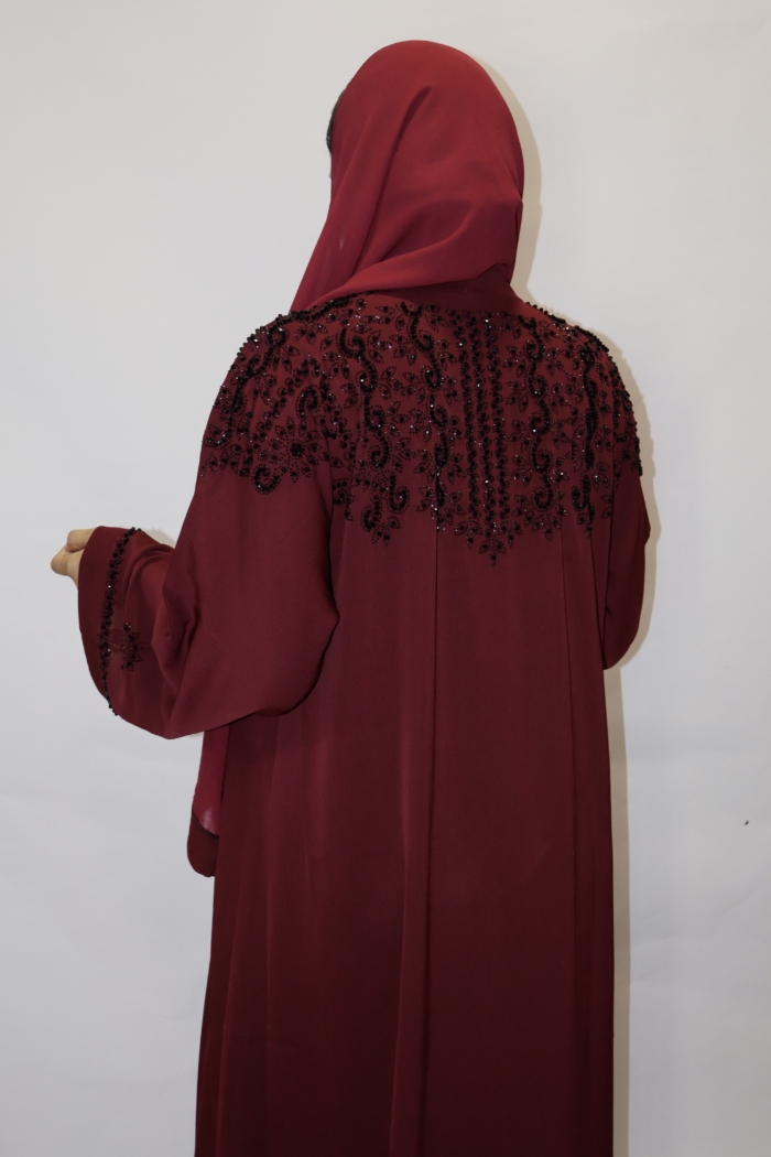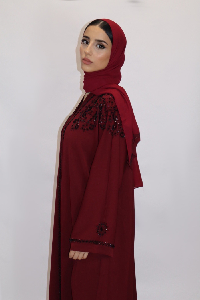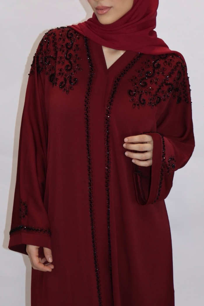 Un diseño sofisticado en tono burdeos con delicados bordados de pedrería negra en el pecho, mangas ,espalda y frontal. Una pieza única que combina elegancia y distinción, ideal para ocasiones especiales y días memorables.