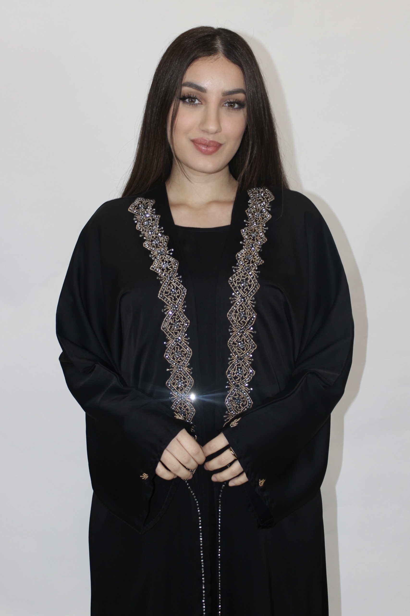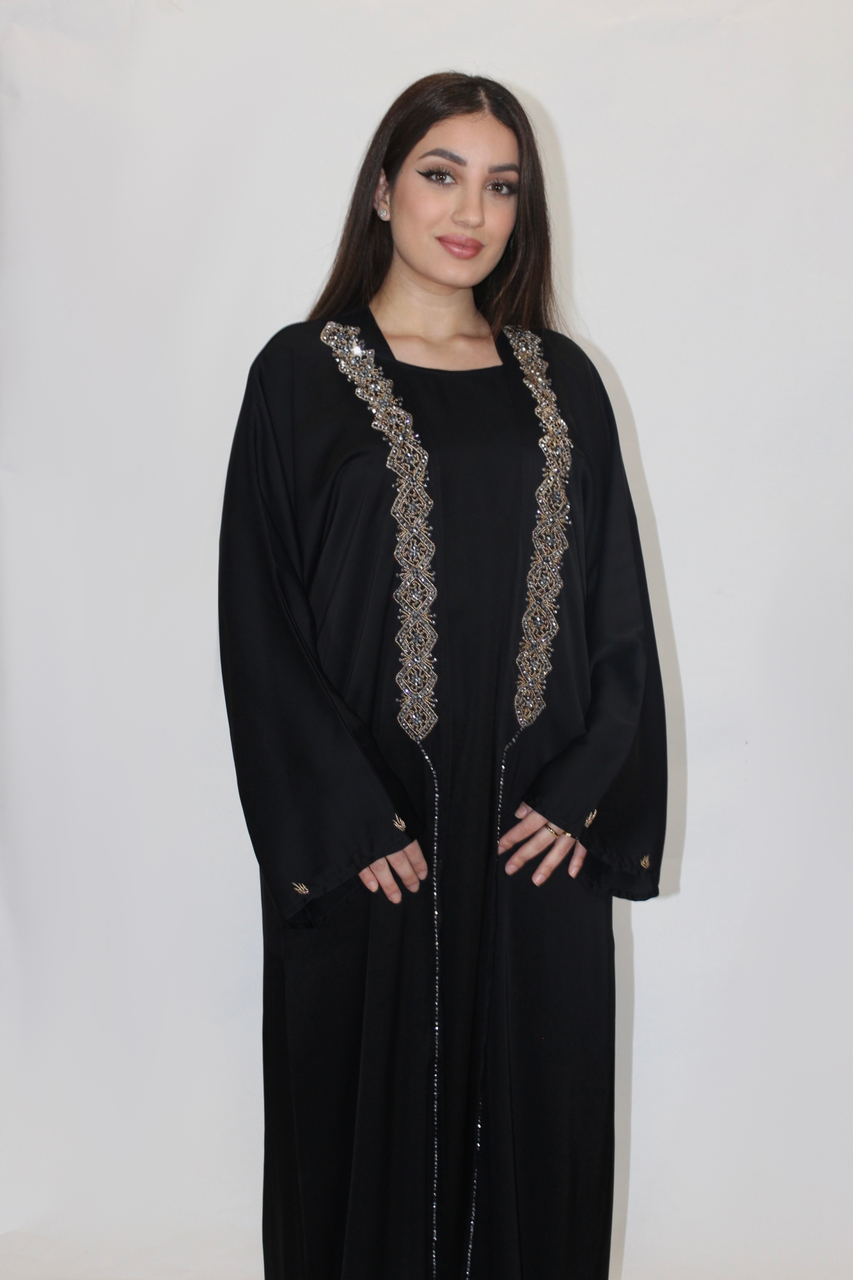 Abaya elegante de dos piezas diseñada para transmitir lujo y feminidad con un estilo que no pasa de moda. Este modelo destaca por su pedrería cosida a mano con detalles dorados y plateados que aportan un brillo sofisticado sin perder la elegancia minimalista característica de la moda modest fashion.