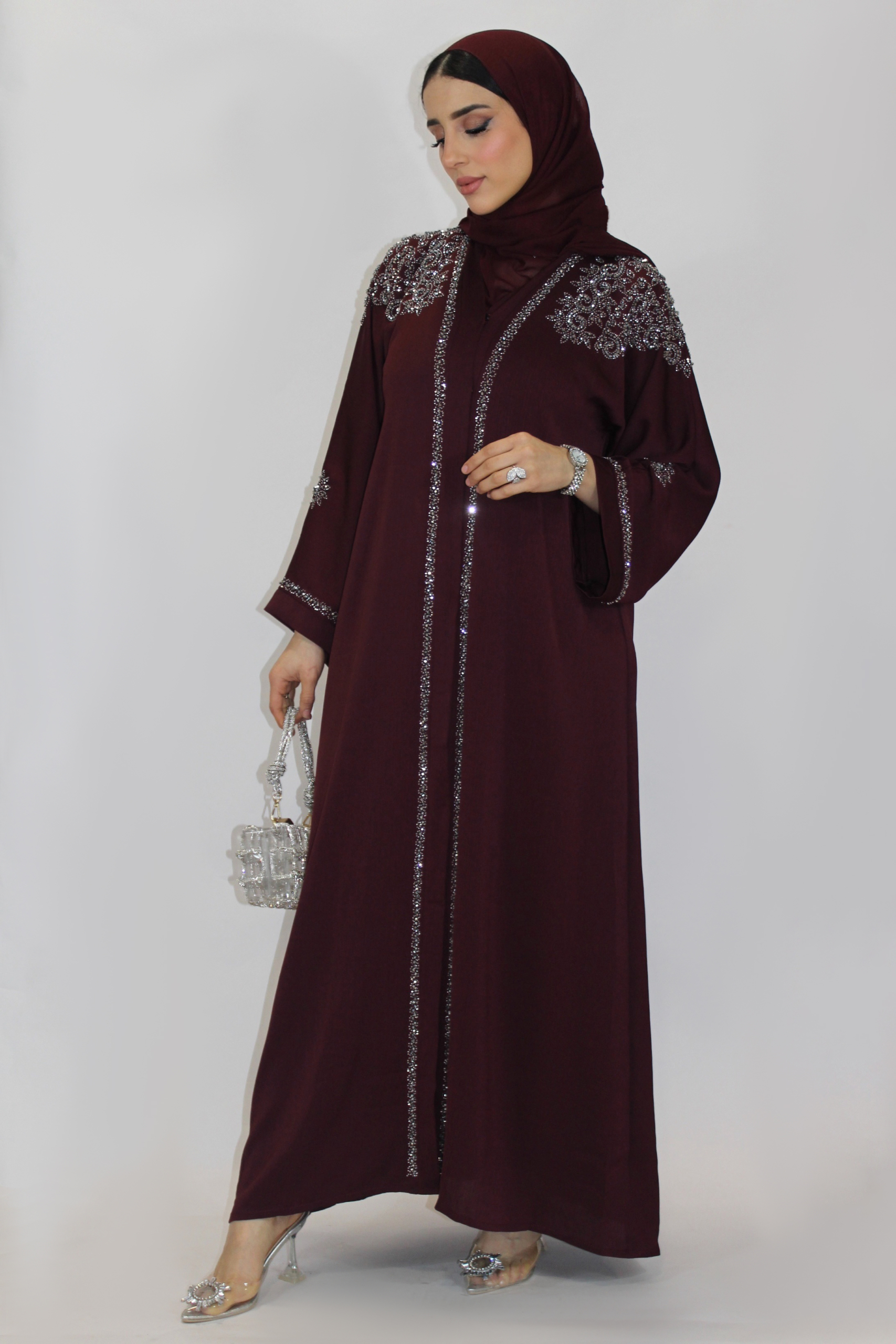Confeccionada en un tejido fluido de alta calidad que no se arruga, esta abaya negra incorpora delicados detalles de pedrería sobre hombros y mangas que aportan un brillo sofisticado y discreto.