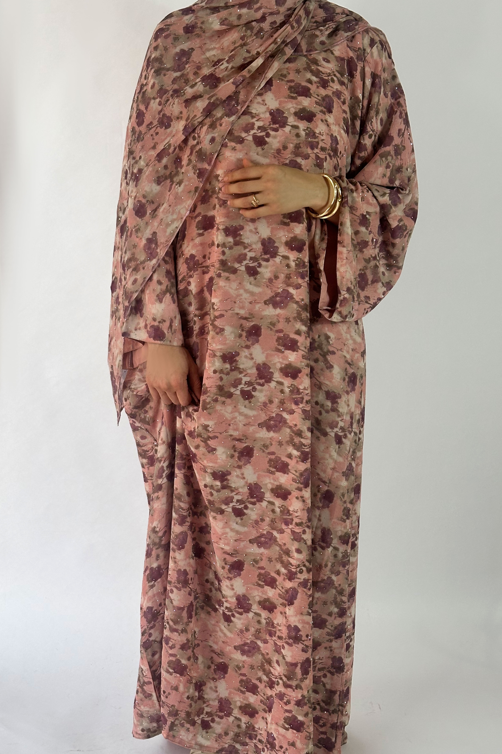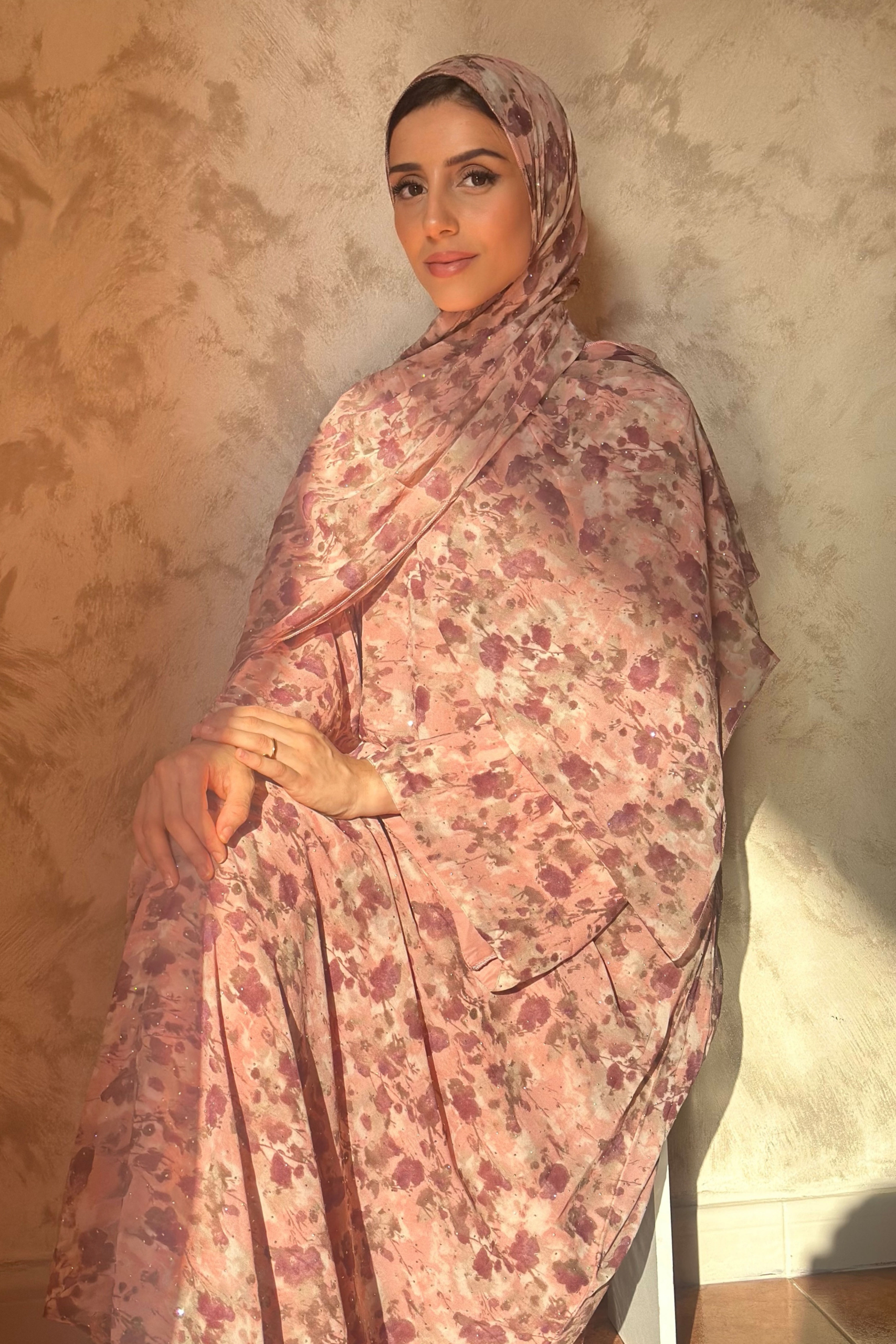 Conjunto de vestido y hijab floral con brillos.
