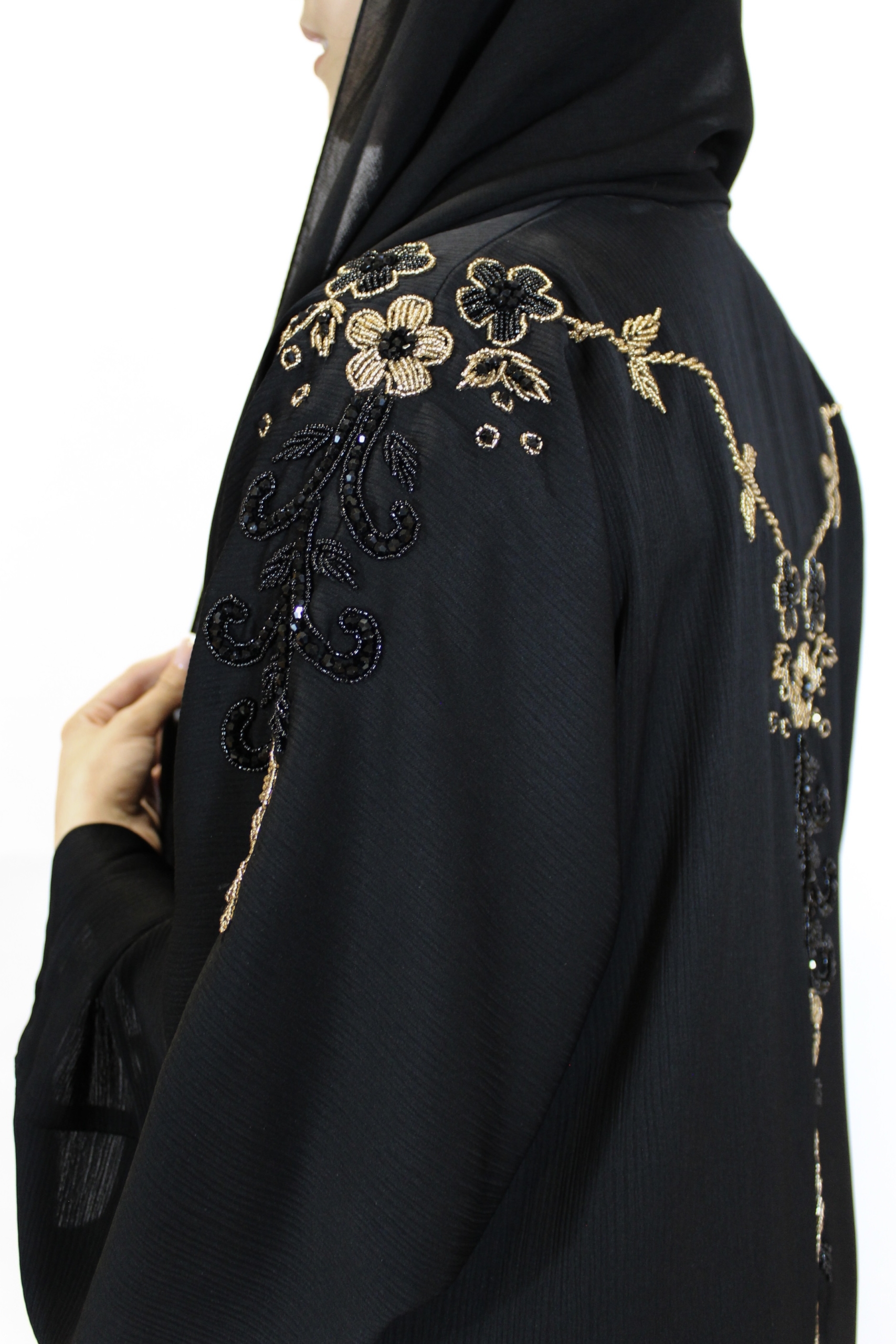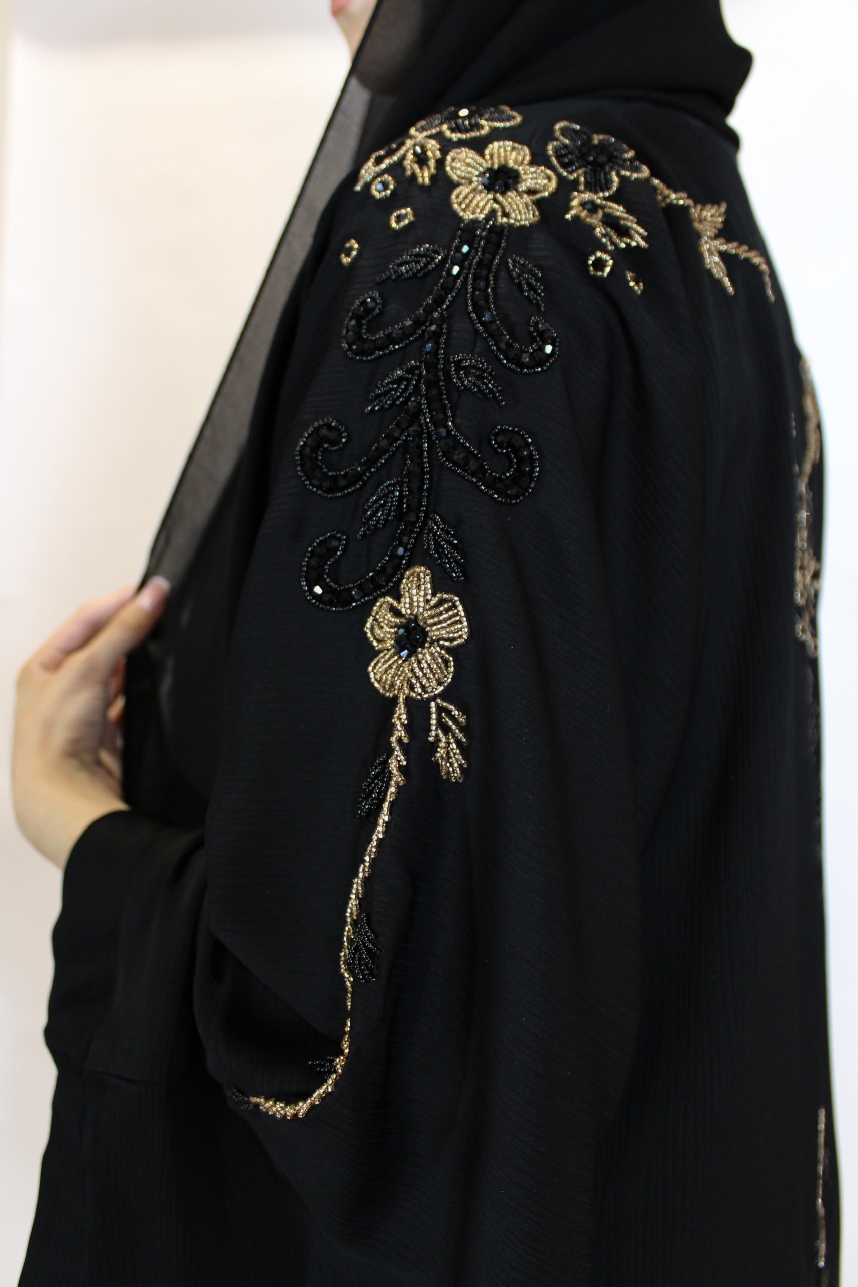 Una pieza sofisticada y atemporal, confeccionada en tela ligera con detalles bordados de pedrería negra y dorada que caen por los hombros y espalda que realzan su elegancia. Disponible en negro perfecta para ocasiones especiales o un look refinado del día a día.