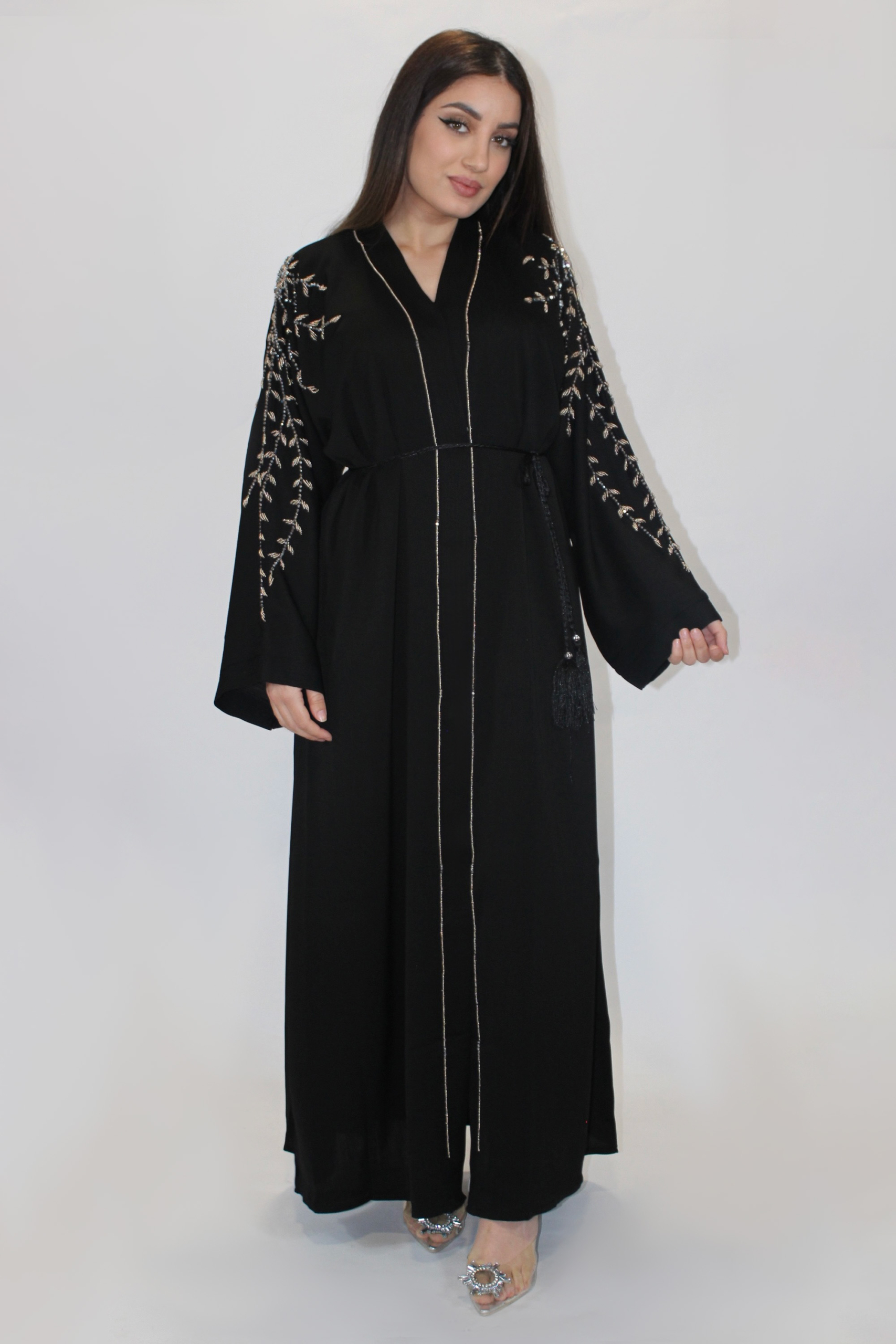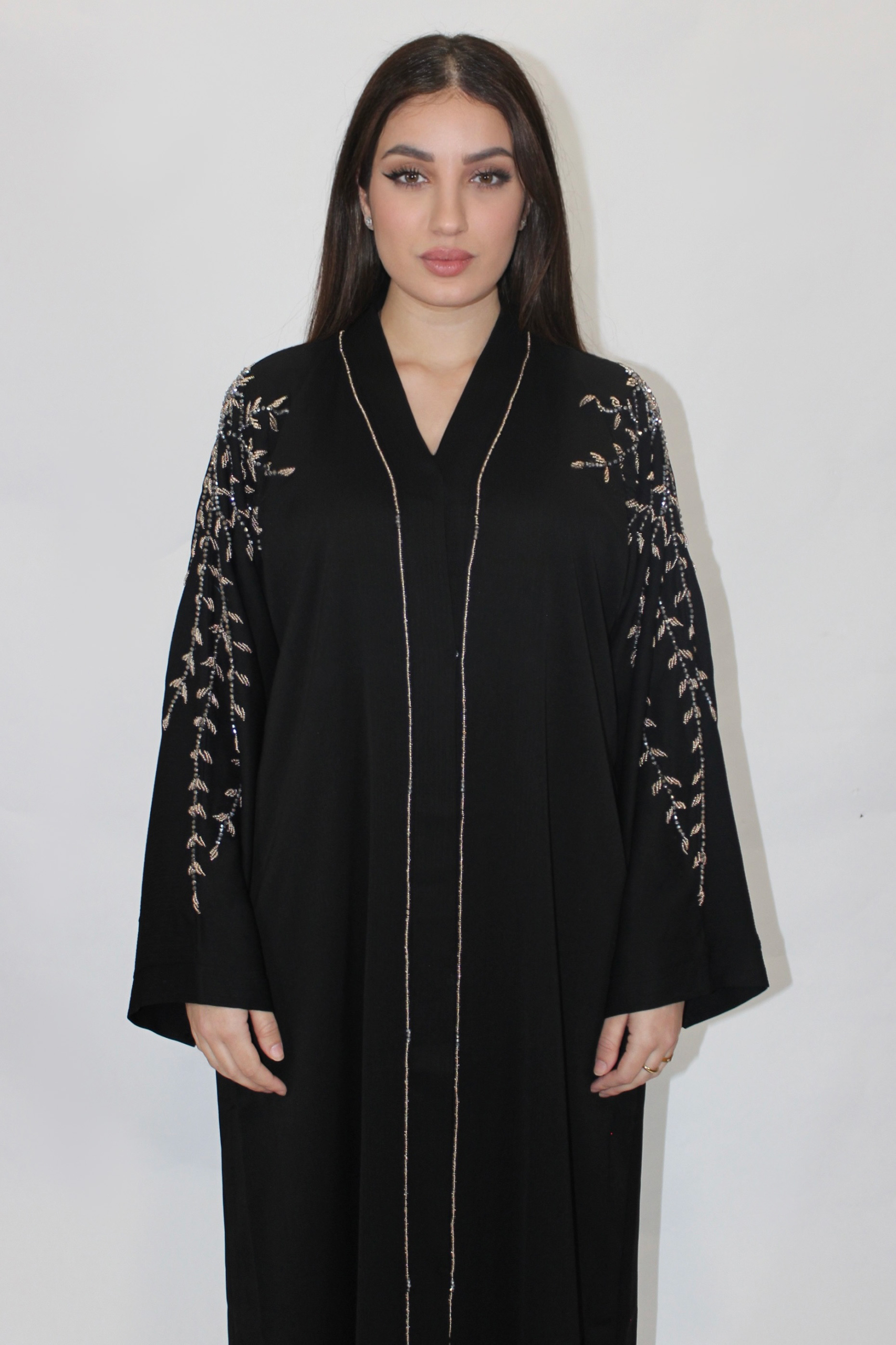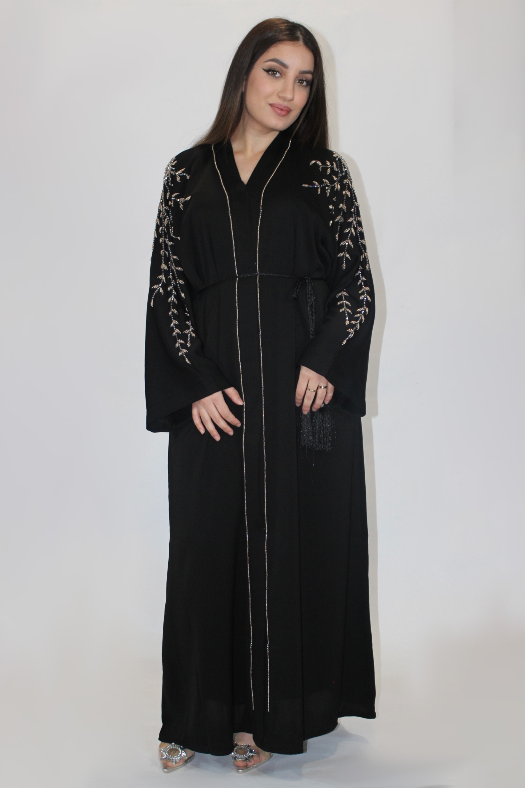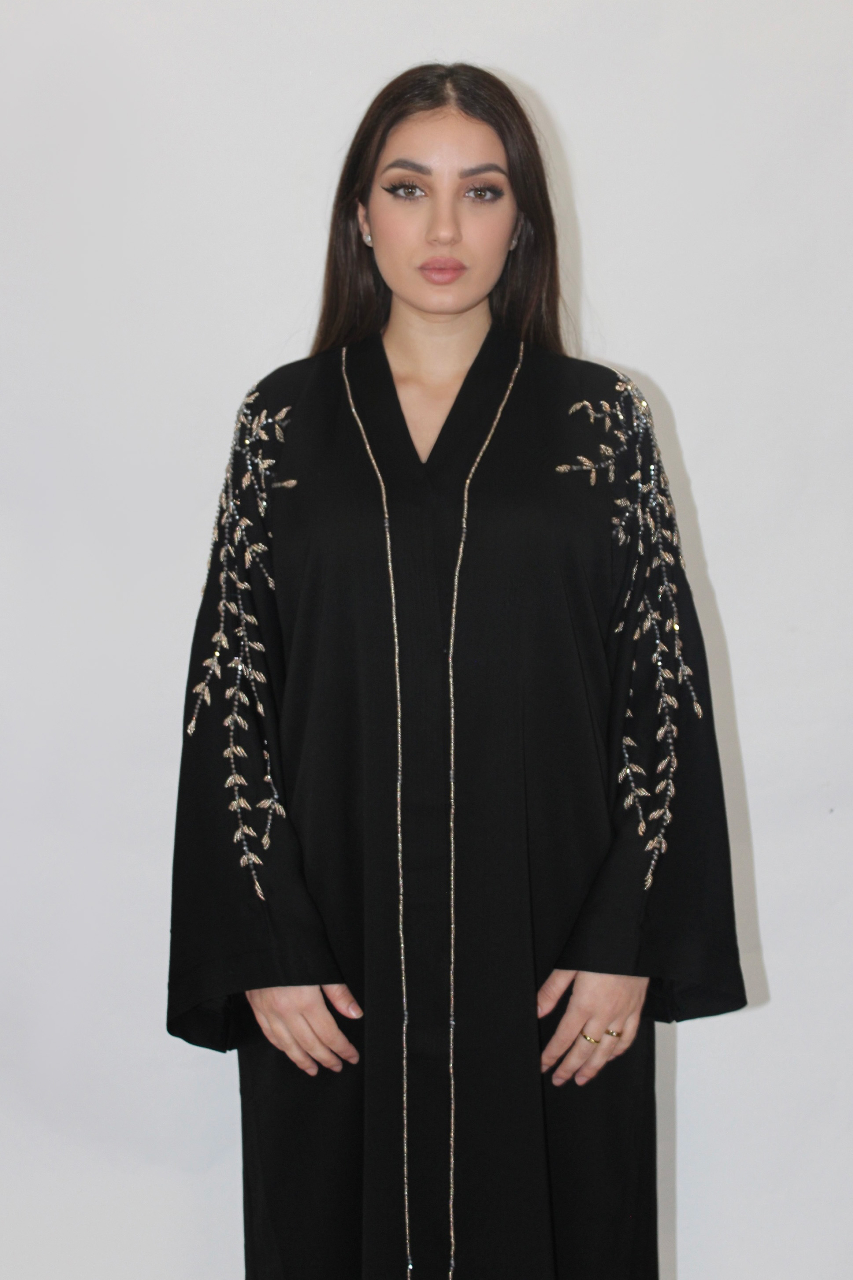 Abaya negra de corte fluido confeccionada en tejido ligero y de excelente caída, diseñada para ofrecer elegancia y comodidad en cada movimiento. Su diseño minimalista se realza con delicada pedrería dorada bordada a mano en las mangas, creando un efecto sofisticado y luminoso que aporta distinción sin perder la esencia clásica.